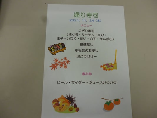 行事 · 24日 11月 2021 お寿司を食べました 朝晩と寒くなり、いよいよ年末が近づいて参りました。 本日11月24日は年に1回のお寿司の日でした。 ノンアルコールビールやジュースと共に、ご利用者様と職員一同一緒に楽しみました。 tagPlaceholderカテゴリ: 行事